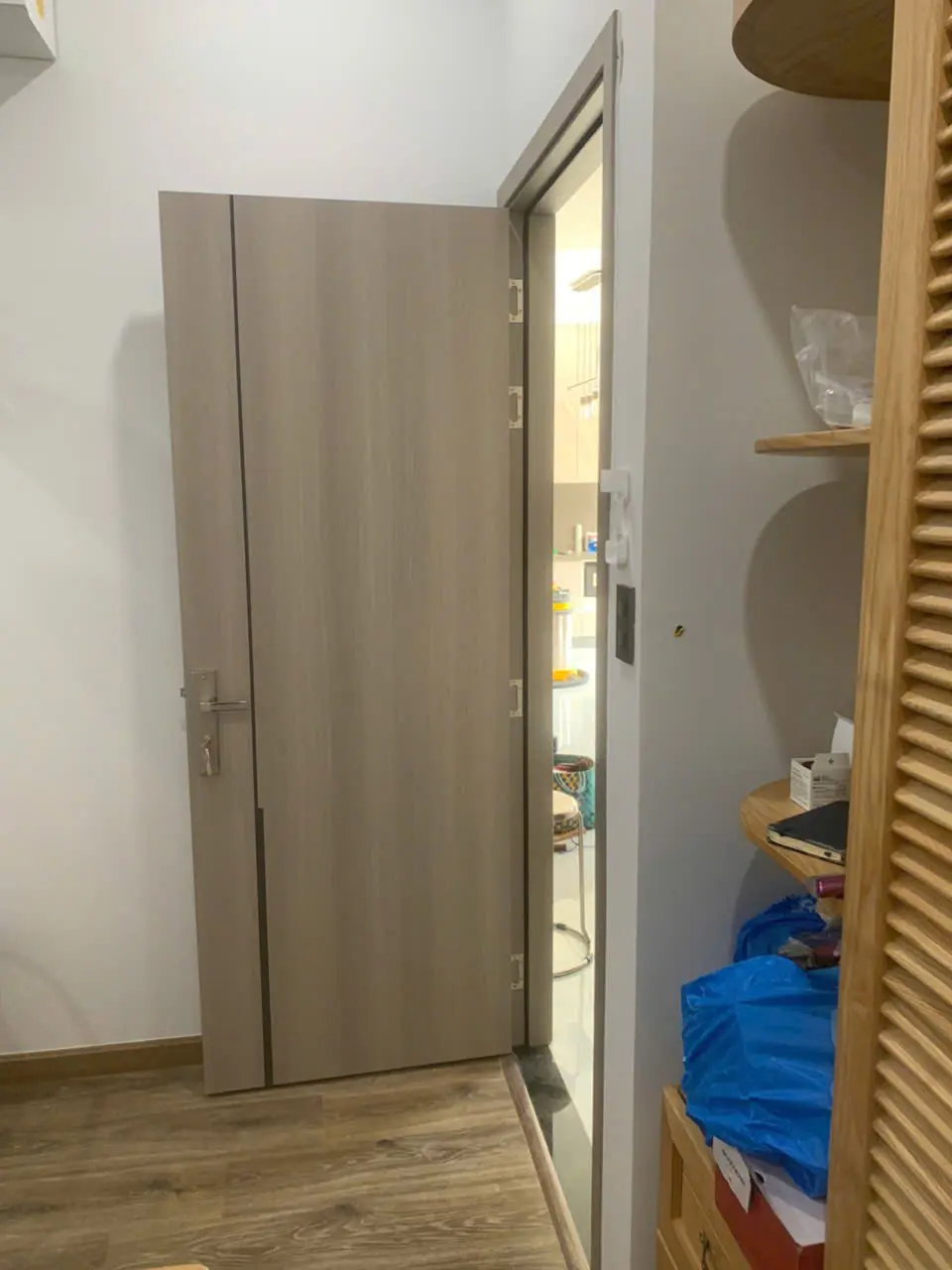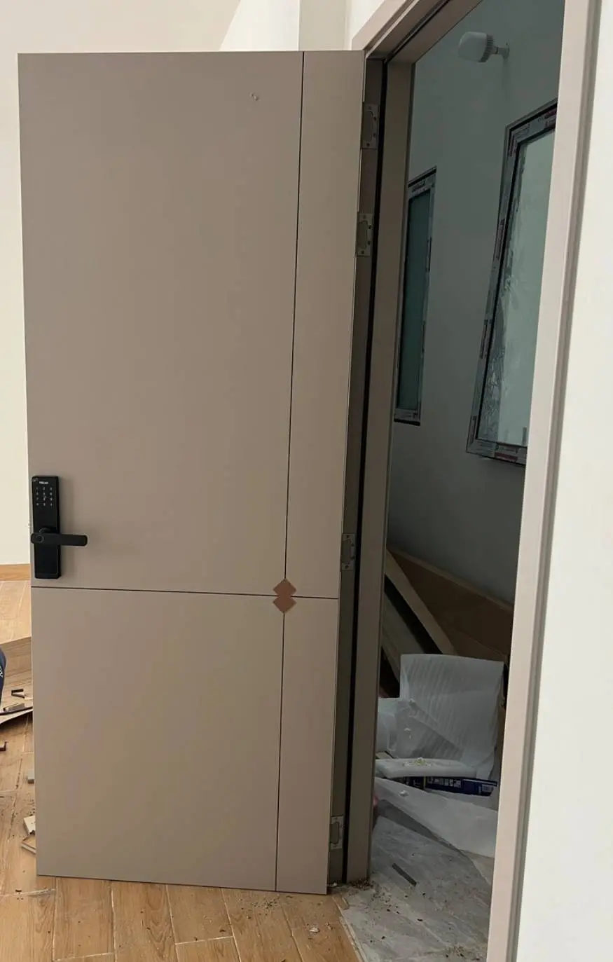 Nặng từ 40kg- 45kg tùy theo kích thước. Cửa nhẹ hơn so với cửa gỗ truyền thống khác và cửa kim loại. Cửa đóng mở êm tay.